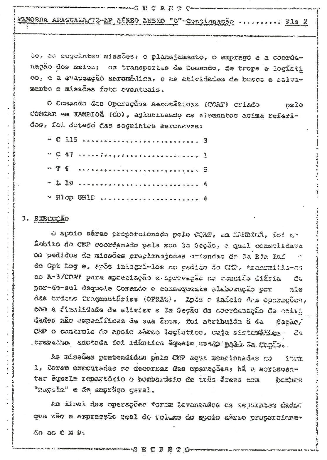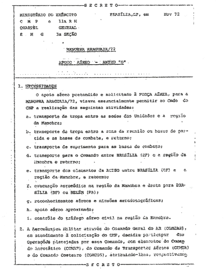 O item 1 do relatório, a que se refere Araújo descrevia o apoio aéreo pretendido e solicitado à Força Aérea, durante a Manobra Araguaia/72. A ação visava essencialmente permitir ao comando do CMP a realização de atividades como transporte de tropas, de suprimentos, evacuação aeromédica, reconhecimento aéreos e missões aerofotográficas, apoio aéreo aproximado, atividades de busca e salvamento e controle de tráfego aéreo civil na região do Araguaia.