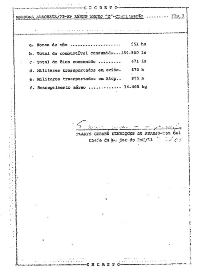 “As missões pretendidas pelo CMP [Comando Militar do Planalto] aqui mencionadas no item 1 foram executadas no decorrer das operações; há a acrescentar àquele repertório o bombardeio de três áreas com bombas napalm e de emprego geral”, diz o relatório elaborado pelo tenente-coronel Flarys Guedes Henriques de Araújo.